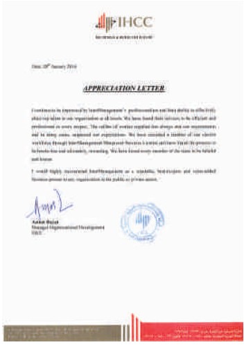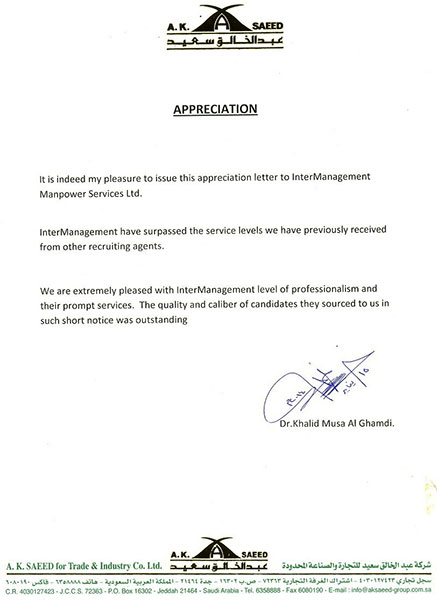 Jeedah Laminated Co www.softdreams.com.sa It is indeed my pleasure to issue the appreciation letter to InterManagement Manpower Services Ltd. We are extremely pleased with InterManagement level of professionalism and their prompt services. The quality Dr.Khalid Musa Al Ghamdi |