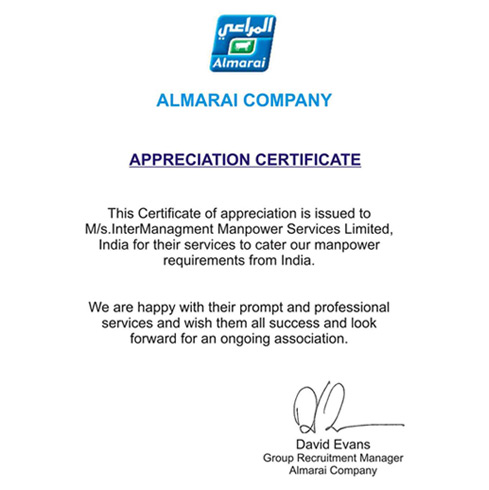 Almarai Company www.almarai.com This certificate of appreciation is issued to InterManagement Manpower