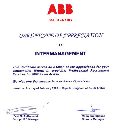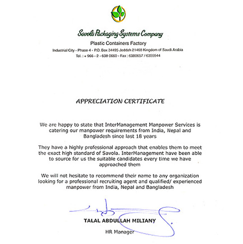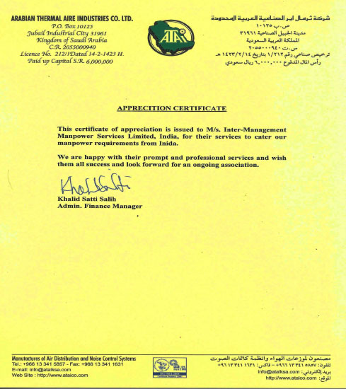Arabian Thermal Aire Industries www.atalksa.com This certificate of appreciation is issued to InterManagement Manpower Services Limited for their services to cater our manpower requirements from India We are happy with their prompt and professional services and wish them all success and look forward for ongoing association