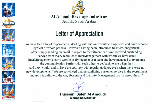 AQS Pepsi Saudi Arabia www.q3group.com Between 1985 and 1988 we had to change our recruiter in India for more than eight times . When we lost our faith in the Indian recruiting agents, one of our business associates recommended InterMaganament , we were hesitant. But with out first dealing with InterManagement, we have to change our view about Indian recruiting agents, all are not same, there is one professional group – InterManagement From 1989 we are dealing with InterManagement , We have to accept one fact that their slogan. To server fully,, promptly and efficiently, to server beyond the terms of contact- is a honest one Saed Al Shahrani - Personal & Admin Manager |