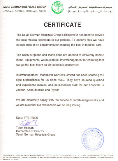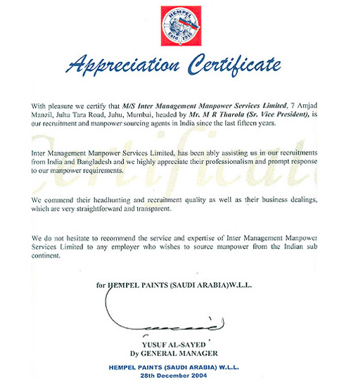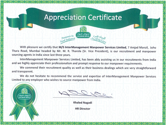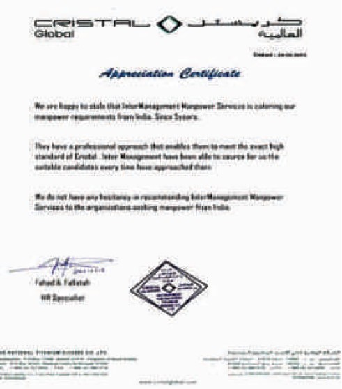 Royal Guard of Oman , Muscat Its is our pleasure to certify that M/s InterManagement Manpower Services Limited, Mumbai, India is catering our manpower requirements since last three years. We are extremely happy with their services. Till we contacted and signed contract with InterManagement, we were changing our recruiting agent for every recruitment campaign as we were not satisfied with their servires. Moosa Bin Hamdan Al Yusufi - RGO Expatriate Affairs Section |