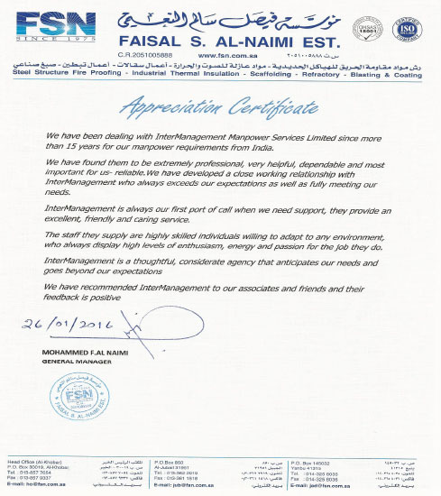 Faisal Naimi Est www.fsn.com.sa We have been dealing with InterManagement Manpowe Services more than 15 years for our manpower requirements from India . We have found them to tbe extremely professional, very helpful, dependable and most important for us reliable. We have developed a close working relationship with InterManagement Who always exceeds our expectations as well as fully meeting our needs. Intermanagement is always our first port of call when we need support , they provide an excellent friendly and carrying service. The staff they supply are highly skilled individuals wiling to adapt to any environment, who always display high levels of enthusiasm, energy and passion for the job they do. InterManagement is a thoughtfully, considerate agency that anticipates our needs and goes beyond our expectations.