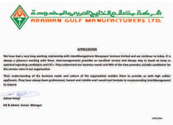 Arabian Gulf Manufacturers Limited www.gulfmaid.com We had a very long working relationship with InterManagement Manpower Services Limited and we continue to toady. Its is always a pleasure working with them. InterManagement provides an excellent service and always stay in touch to keep us updated regarding candidates and CV’s . They understand our business needs and 99 % of the time provides suitable candidates for the various roles in our organizations. Their understanding of the business needs and culture of the organization enables them to provide us with high calibre applicants, They have always been professional, honest and reliable and I would not hesitate in recommending InterManagement to any one