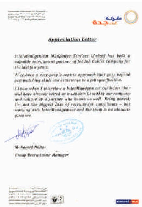 Jeddah Cable Co www.energya.com InterManagement Manpower Services Limited have been a valuable recruitment partner of Jeddah Cables for the last few years. They have a very people-centric approach that goes beyond just matching skills and experience to a job spec. I know when I interview a InterManagement candidate they will have already vetted as a suitable fit within our company and culture by a partner who knows us well. Being honest, I am not the biggest fans recruitment consultants – but working with InterManagement and the team is a absolute pleasure Mohamed Nahas - Manager Personnel Affairs |