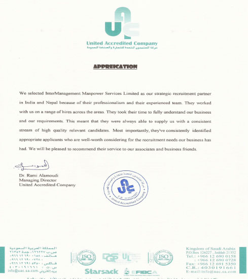 United Accredited Co Jeddah www.uac.sa.com We selected InterManagement Manpower Services Limited as our strategic recruitment partner in India and Nepal because of their professionalism and their experienced team. They worked with us on a range of hires across the areas. They took their time to fully understand our business and our requirements. This meant that they were always able to supply us with a consistent stream of high quality relevant candidates. Most importantly they've consistently identified appropriate applications who are well worth considering for the recruitment needs our business has had. We will be pleased to recommend their services to our associates and business friends |
